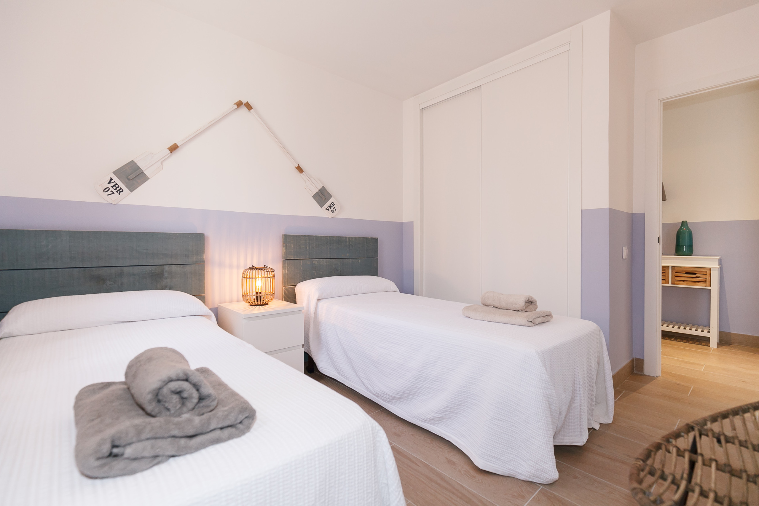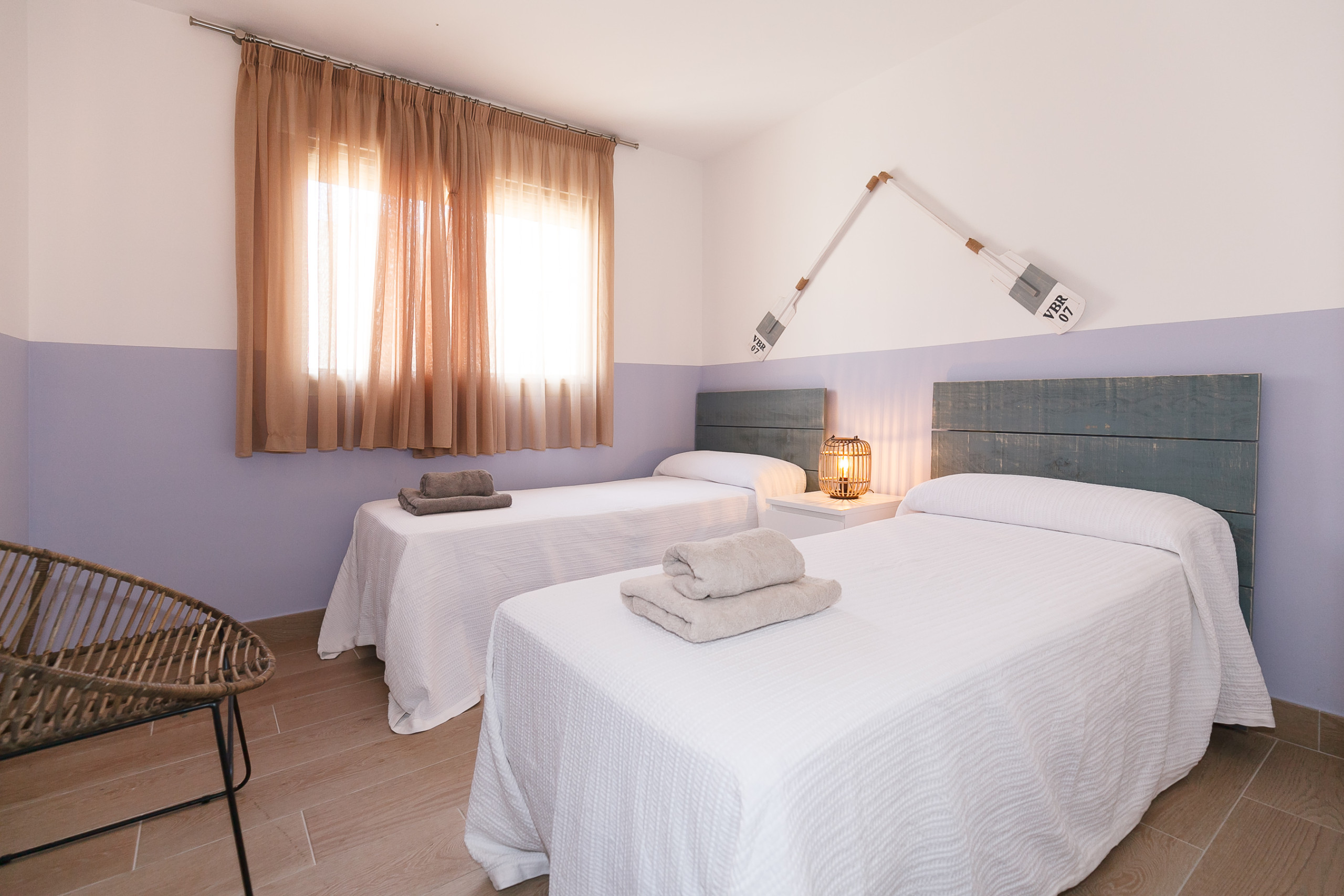 Segunda habitación con camas estrechas para adultos.
